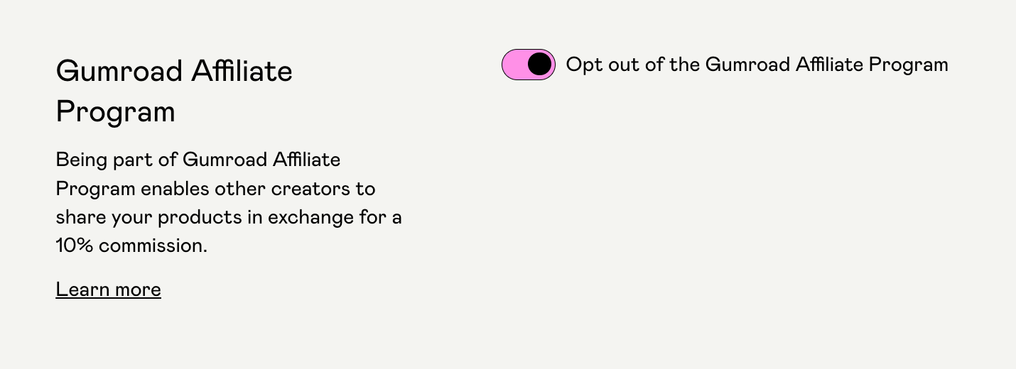 Both of these affiliate programs are optional. You can remove Your Affiliates or opt out of Gumroad Affiliates anytime.